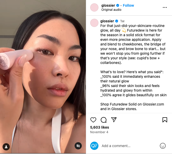 The company emphasizes user-generated content (UGC), which fosters engagement and feelings of authenticity. Glossier now boasts over 3.1 million Instagram followers. The company still relies on UGC and partnerships with influencers, but today the brand can also reach millions of users with its own posts.