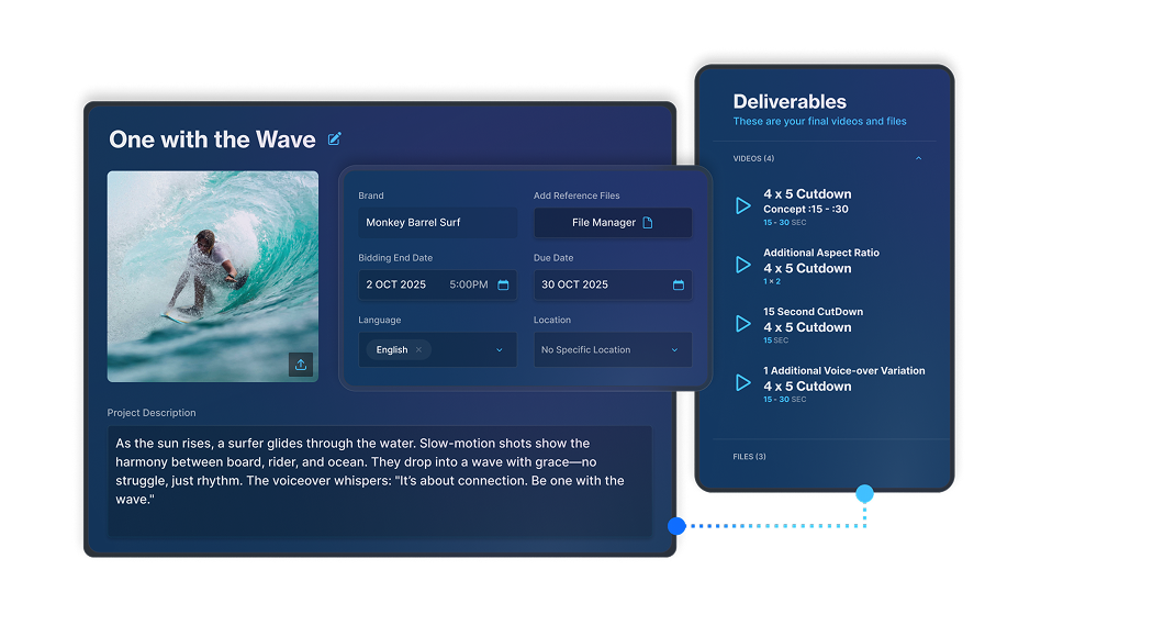 Have a full brief or just a napkin sketch of an idea? We’ll match your project with a video pro in the exact format and style you need, so you get standout creative that fits your brand voice and brings your vision to life.