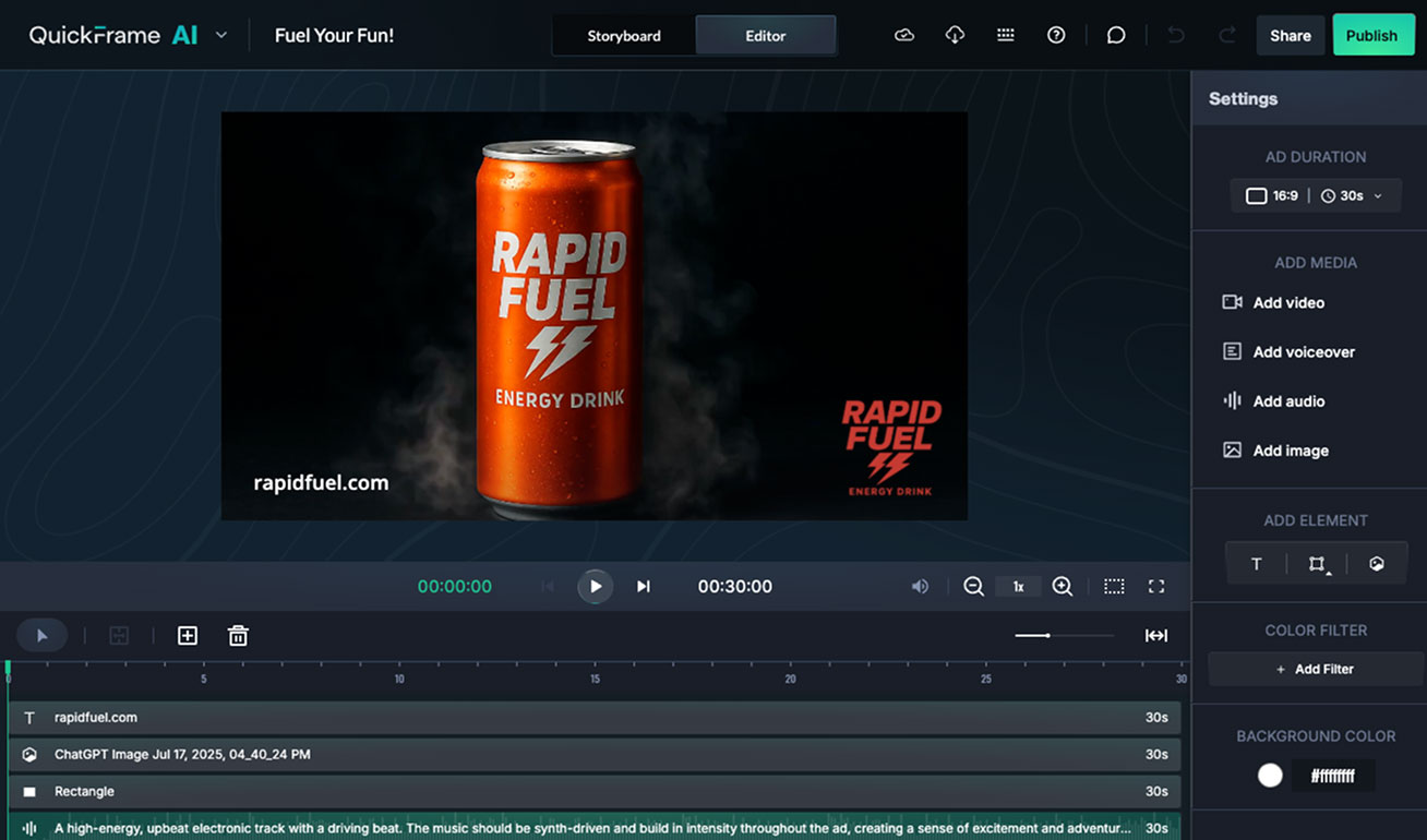 With QuickFrame, you’re never starting from zero. Bring your brand, choose your style, and we’ll generate a full commercial to get you started. Want a more hands-on touch? We’ll match you with a pro who’ll bring your vision to life — any style, any screen.